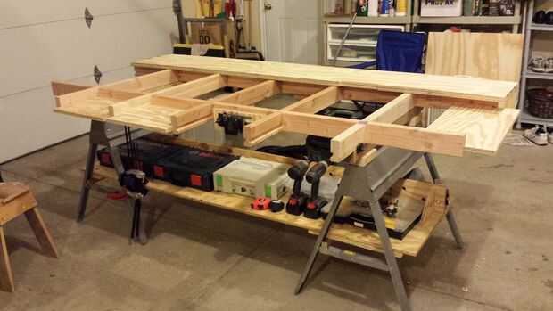 Nunca me ha gustado romper madera contrachapada sobre dos caballetes, como no sentir muy seguro para mí. Así que hay una razón para construir una mesa sencilla de trabajo / tabla de corte de madera contrachapada. Debe ser fácil para arriba y toma el espacio muy pequeño en la tienda.