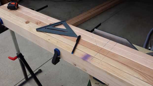 Extienda las muescas 12" desde cada extremo mientras que todavía se sujetaron juntos y (5) de ellos se colocaba 16" de uno a otro en dos de los 8' largo apoyando vigas.