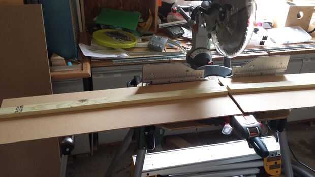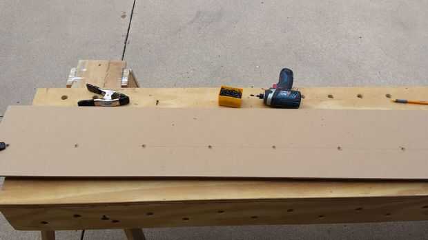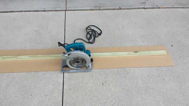 Encontré algunos 1/4" dura del tablero cerca de 9" de ancho y 6' de largo y arrancó un pedazo de pino tablero 2" de ancho y corte a 6' largo como el borde recto. Colocar la madera de pino de 5.5" de un extremo de la placa dura, que es un poco más ancha que la medida de un borde de la placa base de mi sierra circular de Makita la hoja y atornillado de la parte inferior y fregadero contra los tornillos.