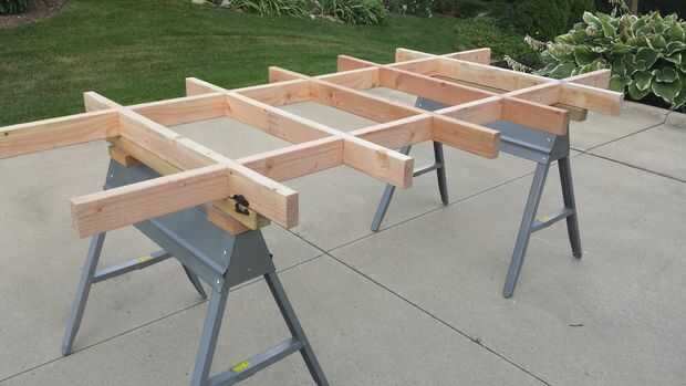 Cuatro pestillos de la ventana fueron utilizados para bloquear la mesa en los caballetes. Para lograr los cierres, necesitamos algún tipo de función de parada en los caballetes. He utilizado cuatro piezas de las espigas flotantes (Festool domino), o un trozo de tablero pegado al otro lado de la 2 x 4 en los caballetes que tienen la misma finalidad. Si eso es todavía demasiado apuro, perfore cuatro agujeros en los dos travesaños y abrazaderas de uso (4) para asegurar la mesa será una solución sencilla.