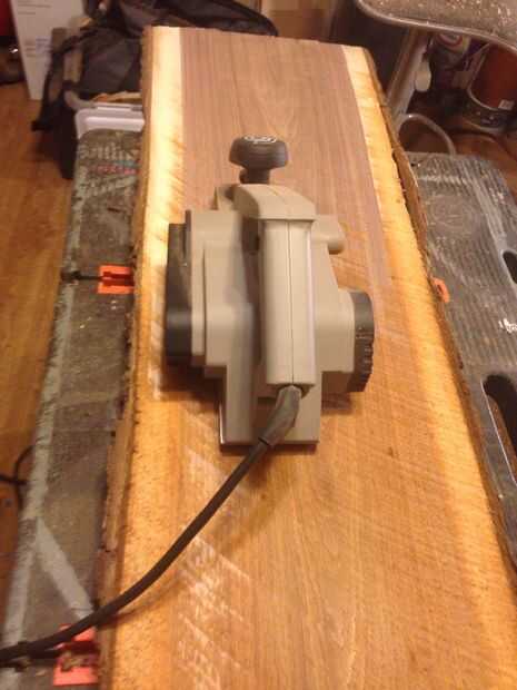 Plano de la madera y quitar la corteza. Usé un cepillo eléctrico de porter cable para acelerar las cosas para arriba y porque tengo uno. Un avión de la mano sería hacer el mismo trabajo, tan sólo tiene que utilizar lo que usted está cómodo con.