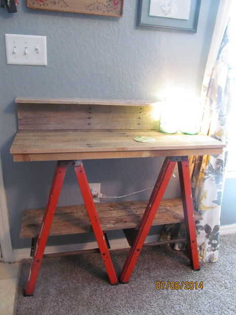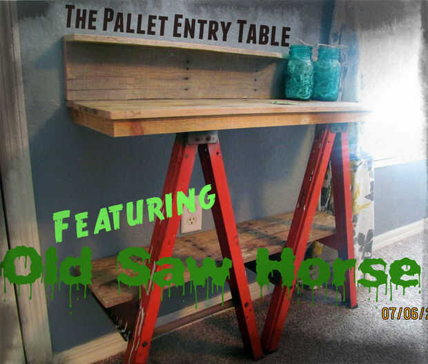 Esta es una tabla que construido a partir de un viejo, libre, acero Sierra caballo vecino dio yo y algunos viejo, madera de palet. Estaba bastante este para hacer y la idea de mi esposa.