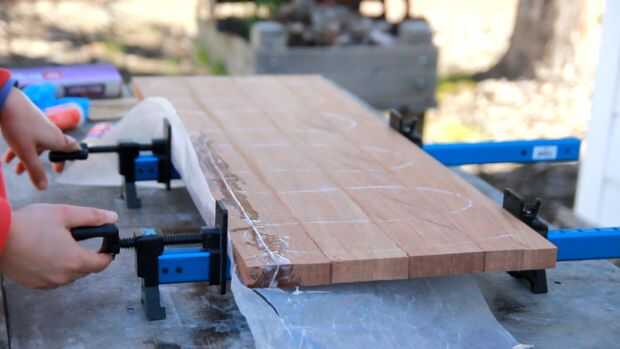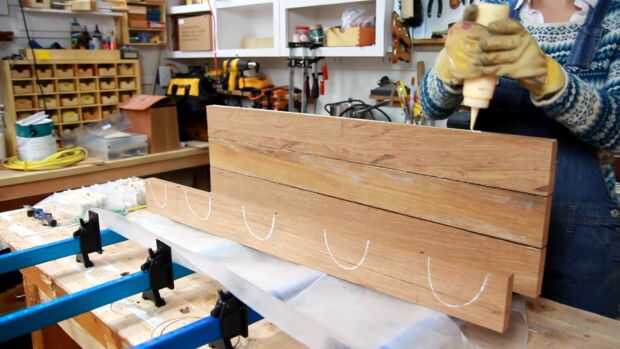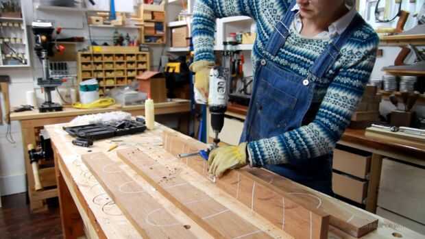 Primero estoy arreglando la madera, trazar las líneas para recordarme qué lado es, de trazado donde las clavijas tiene que ir, y entonces usando el enclavijar aquí la plantilla para perforar. Pensé tres orificios para taquetes a través de la pieza deben ser abundante, así bajando la línea en cada tablero. Poner pegamento y sujeción todo juntos.