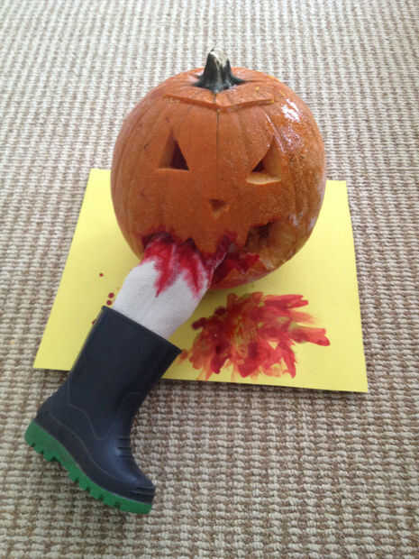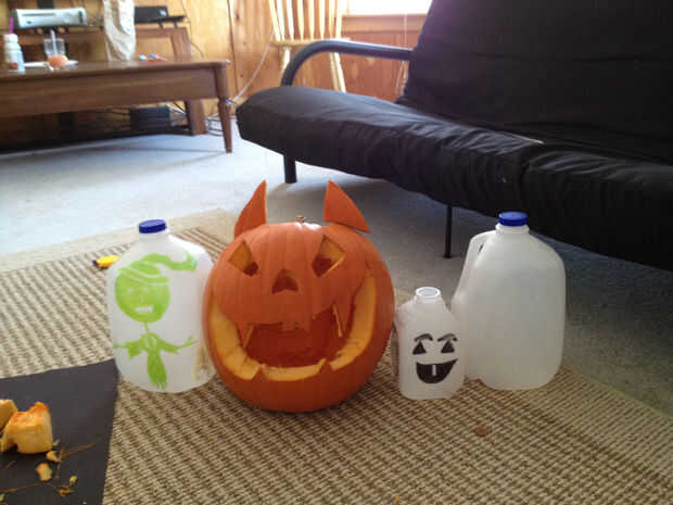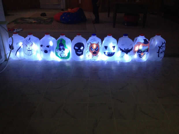 A través de la casa, dentro y fuera. Colocamos faroles de jarro de leche que hemos pintado con temas de Halloween. Bastante divertido para hacer con mi hijo de lil :)