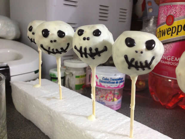 Se hacen usando cualquier sabor pasteles y crema de su elección. Tarta de Crumble, mezclar con crema, forma bolas y sumergir en chocolate derretido. Para hacer el gato, tenía sobra glaseado real de hacer galletas. Teñido negro y pipa Jack auténtico rostro, ojos y sonrisas