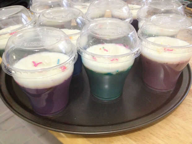 Ya que es para Halloween, había teñido con colorante alimenticio azul verde, púrpura, negro, oscuro oscuro oscuro les. Tienes que añadir el color de los alimentos al tiempo que la jalea. Que utiliza polvo de agar-agar para la jalea (disponible en tiendas asiáticas o en línea), pero marca como Amira o gelatina puede utilizarse también