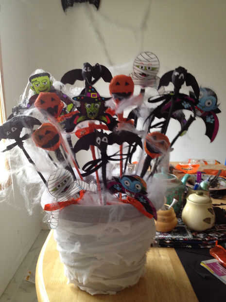 Murciélagos de polos: en el papel negro, dibujar y cortar alas de murciélago. Sobre papel blanco, dibujar y cortar formas redondas para los ojos. Envolver caramelos con streamer negro luego asegúrelo en brochetas. Cubrir la brocheta con streamers negro/naranja. Pegar las alas en polos y pegar ojos. Decorar con pequeñas cintas. Tienes su palo piruletas. Introducirlos en la espuma