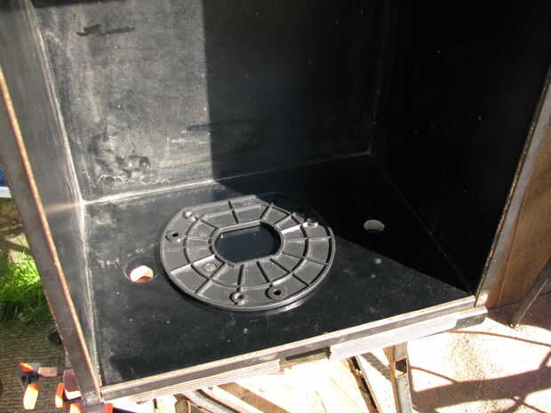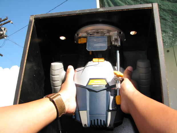 Después de mover el router detrás en la posición deseada, apreto la unidad hacia arriba en la parte inferior de la superficie superior de la tabla. Los anillos de cinta mantenidos sujeta sin lo que es difícil de quitar, que me permita transferir fácilmente la ubicación de los orificios de montaje a la mesa.
