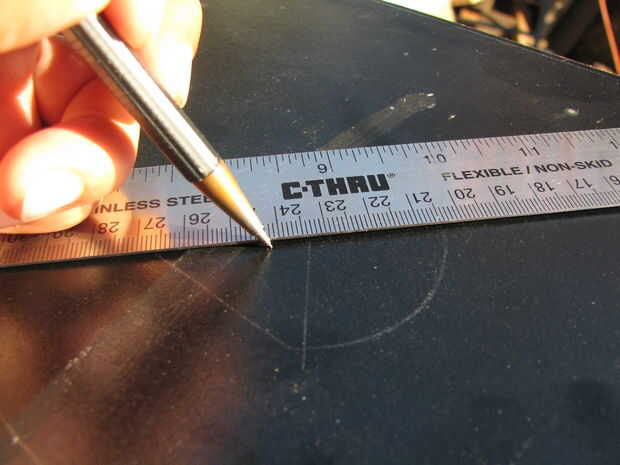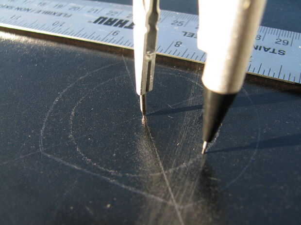 Para el despacho de bit, solamente debían marcar el punto central de la broca de la fresadora, que era fácil con este router, ya que la apertura tiene rincones que yo podía dibujar una línea a través para encontrar el centro. Luego medí el diámetro de mi granito de arena más grande, que en este caso se redondea 11/2" para el mayor de mis dos pedacitos de ronda. Usando esta medida, era capaz de marcar un círculo con un compás que más tarde sería cortar para permitir que la broca pueda atravesarlo.