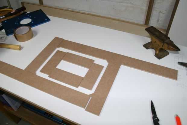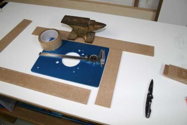 Fije la placa de inserción a la parte superior, en la posición que quieras que sea, con cinta de doble cara. Cinta recta tiras de MDF de 1/4" alrededor de la placa, separada por la distancia calculada. Pelar encima de la placa de inserción y luego la cinta abajo algunas piezas de MDF en el centro, para ayudar a proporcionar la estabilidad para el router de 1/4". La posición de estas piezas interiores no es crítica, siempre que sea suficientemente amplia que puede dirigir un área mayor que el ancho del labio que quiere acabar con la brecha entre ellos y el exterior piezas.