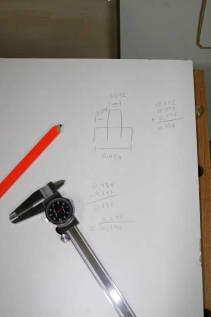 Construí mi plantilla de tiras rectas de 1/4" MDF, sujeta con cinta de la alfombra de doble cara. Como he dicho, la dimensión crítica es el desplazamiento, la distancia entre la parte exterior del casquillo y el exterior de la broca. Esto es igual al radio del casquillo menos el radio de la broca, o la mitad de la diferencia entre el diámetro del buje y el diámetro de la broca.