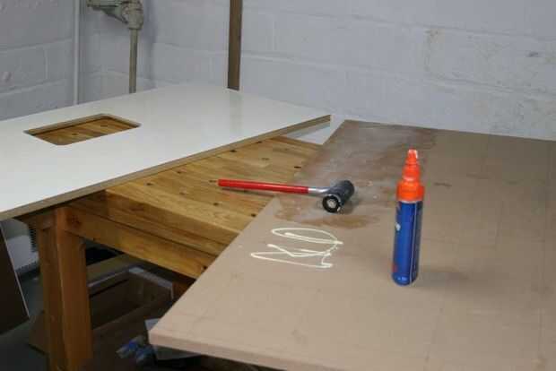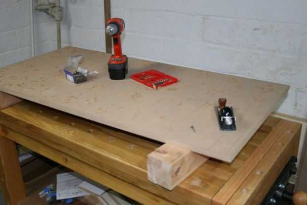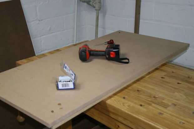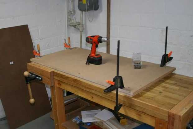 Una vez que las esquinas opuestas atornilladas, fije ambas piezas hasta tu superficie de trabajo. Si su parte superior es plana, Esto forzará el MDF y la melamina al ser plana, mientras el pegamento seca. (MDF abisal ni melamina es tan dura como parece. Tanto tendrá fácilmente en las curvas sutiles que te no darán fin de dolores de cabeza, si les permite sobrevivir a su producto final.