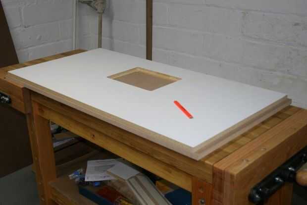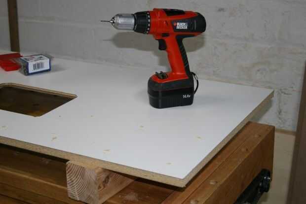 Aplique una capa fina sobre cada superficie (parte inferior de la tapa y la parte superior de la inferior). El MDF de la melamina en la parte superior del tirón, alinee los orificios e introducir unos tornillos en las esquinas opuestas. No apriete hacia abajo, dejar cierta holgura. Encontré que levantando la capa superior por un par de pulgadas, corriendo luego un punzón a través del orificio, hace fácil conseguir los agujeros alineados.