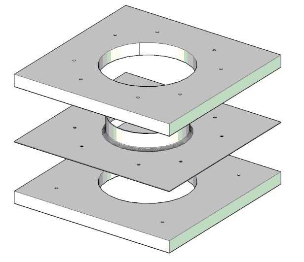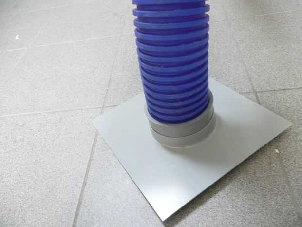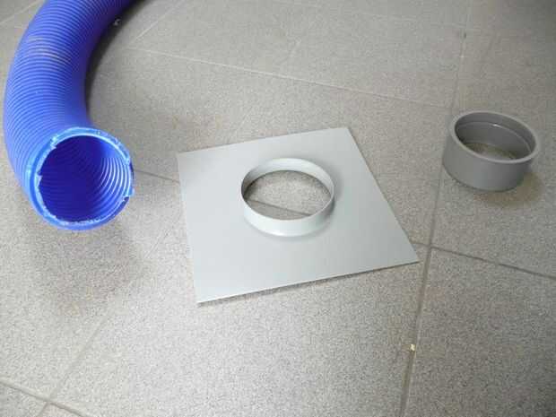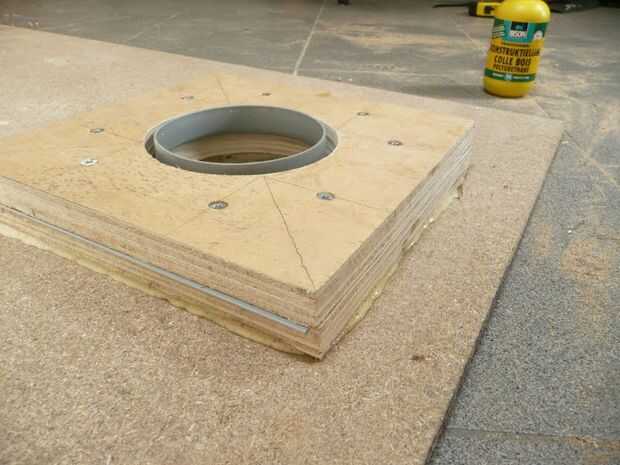 Aglomerado es barato, pero tiene como desventaja: es débil. Para hacer una entrada de aire robusto, la fuerza debe ser distribuido. Por esta razón necesita una hoja grande de PVC (con un agujero en él), que cubre un área grande. Necesitábamos un manguito para hacer el tubo y lamina de PVC encajen firmemente.