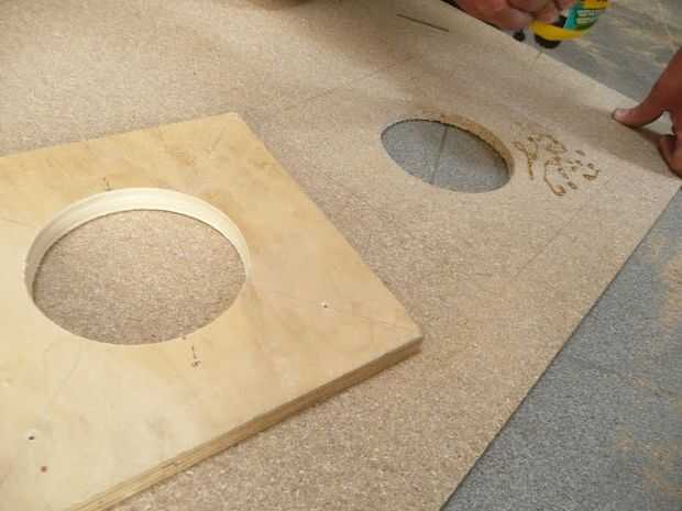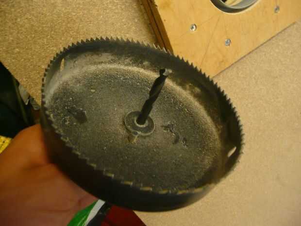 P: Usando una taladro Sierra (ver imagen P), perfore agujeros a través de las dos capas de madera contrachapada. Los agujeros deben ser más grande que el de la hoja del PVC, ya que esta hoja se intercala entre la madera contrachapada. Ahora decide donde quieres tener la entrada de aire (le recomendamos que coloque en una esquina de la placa inferior). Una vez que conoces la posición de la entrada de aire, perfore un agujero a través del conglomerado (abajo).