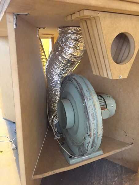 Para crear el suficiente flujo de aire utiliza 2 compresores de aire 550W, conectado a la tubería a la primera capa de la tabla.