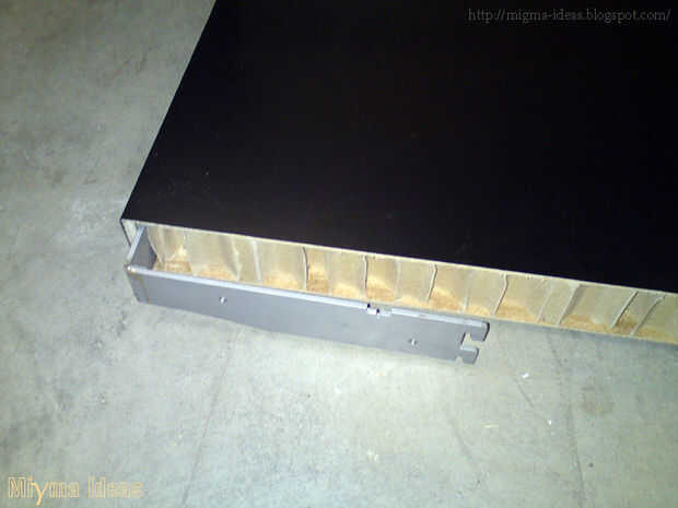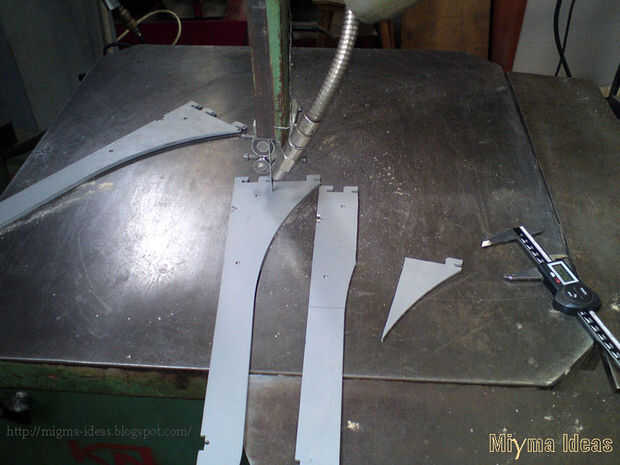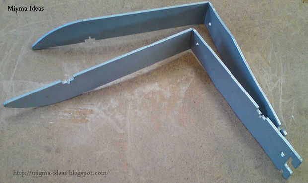 Tiene que marcar una línea recta para cortar en la mitad la tapa de tabla, a continuación, utilizar su sierra favorito ya sea a mano o un powertool solo Asegúrese de ser precisa y suave. Después de había picado la mesa encontrar cuatro soportes como estas en la foto de los mismos como el tipo de buhardilla IKEA. Corte si es necesario, como en la foto y la curva para hacer forma de L con la ayuda de un jigg y un hummer. En mi caso utilicé una herramienta especial para este tipo de flexiones. Tienes que hacer los soportes en L montaje entre los carteles de la mesa. y no olvides hacer 2 agujeros en cada soporte para montar en la pared.