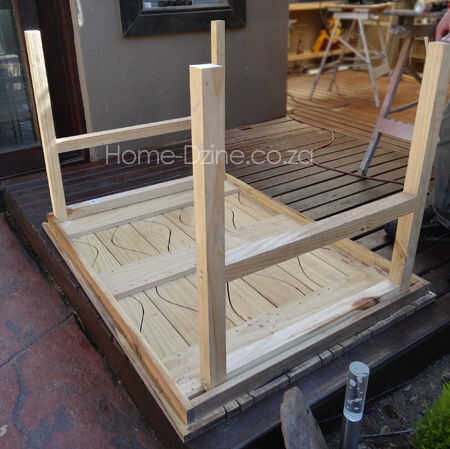 Sobre la marca en el extremo de cada travesaño, taladre un orificio guía de 3mm. Inserte los tornillos de 4.5 x 65mm a través de las piernas y en las vigas transversales.