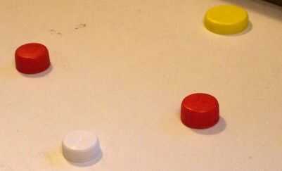Ahora vamos a ver los jugadores. Lo único que tienes que hacer es quitar la tapa de la botella y limpiarlo, si es necesario. Y repetir este proceso hasta llegar a 2 grandes y al menos uno más pequeñas tapas:-). Los colores se recomiendan para ser diferente a jugar fácilmente. Las tapas de los grandes son los guardianes, se colocan en los objetivos, los tapones más pequeños son los otros jugadores y la bola, pero voy a explicar esto en las reglas. Ahora eso es todo.