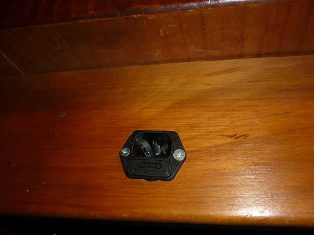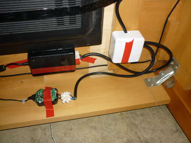 He configurado un euroconector en el lado de la mesa (el tipo de enchufe/toma generalmente usado por ordenadores de sobremesa y hervidores de agua) para hacer las cosas más simples. Esto va a una caja blanca (para mantener la electricidad 250V desagradable de los dedos de los niños) y se divide hacia fuera a los cables que van a la pantalla, el cargador del USB y el amplificador del altavoz (no mostrado).
