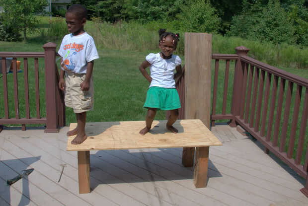 No estoy seguro de qué tan fuerte es esta tabla, pero dos de mis tres pudieron destacar en él con la sacudida de la tabla. Para reforzarla un poco añadiré algunos 1 x 4s para estabilidad y soporte de las patas.