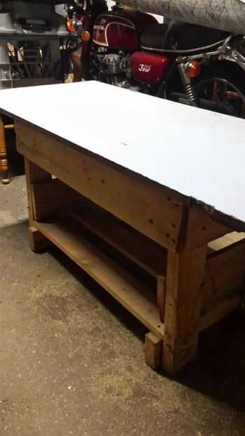 Por desgracia, no tengo ninguna foto de los trabajos en curso. Las imágenes en los siguientes pasos son después de los hechos. Originalmente iba a tomar la madera de la caja de transporte y construir 2 mesas, así que esta foto es la puerta sentado en una de las bases que había construido para ellos. Mientras que resultó, las dimensiones que había bosquejado hacia fuera eran demasiado grandes para una mesa final, pero sólo adecuado para una mesa de la cocina... excepto la altura. Un accidente feliz.
