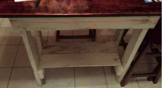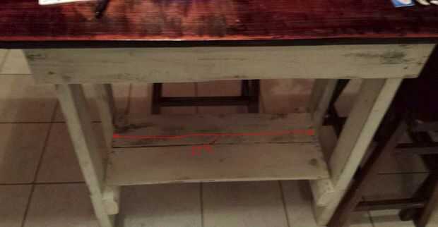 Hice las piezas primero con el refuerzo inferior en el interior y el soporte superior (o falda) en el exterior. Luego me uní a ellos junto con los lados y pie resto de tableros. El reposapiés se sujetan a la parte superior de los tirantes inferiores. Todo fue montado con tornillos de pared seca de 2 pulgadas. Puse dos tornillos en donde se reunieron juntas. Después de eso, pintó la base completa con la pintura de tiza casera, había rascado un poco y luego recubierta con poliuretano semibrillante.