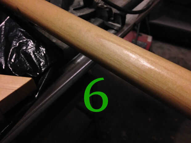 En la foto 5 estoy quitar material del pivote para que pueda deslizarse fácilmente sobre el poste de la sombrilla. Usé los bordes laterales de un cincel para hacer esto. Lenta y uniformemente raspado material hasta que comodamente cabe en la espiga.