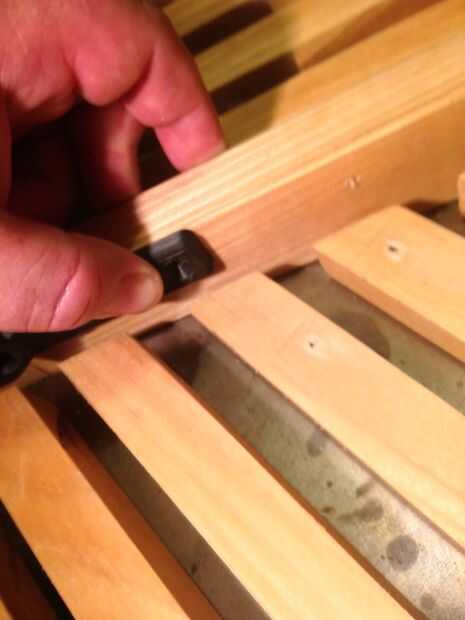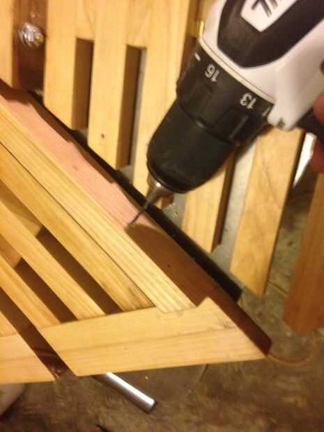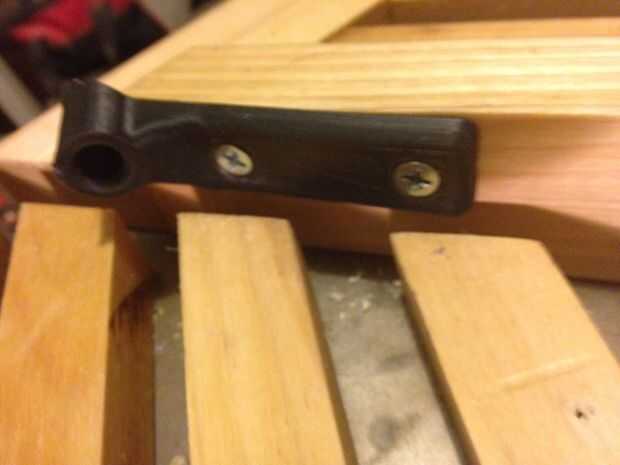 Voltear la mesa boca abajo sobre un paño. Coloque el cerrojo de ventana entre dos listones y línea hasta el receptor en el otro lado. El receptor se cuelgue sobre el borde de la pieza vertical de madera ligeramente. Ver los cuadros proporcionados.