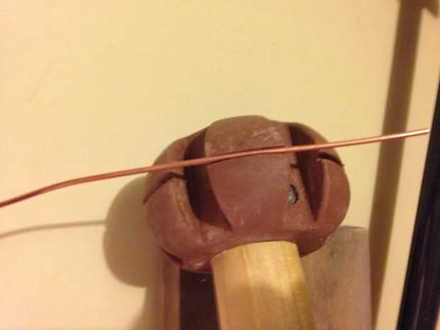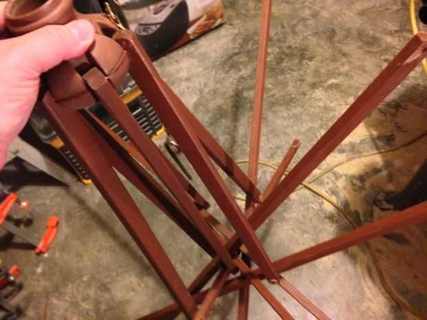 Había roscada un trozo de alambre de cobre a través de los orificios de las costillas del paraguas. Cuando llegué a las costillas en su lugar, me torcí el alambre hasta que fue apretado y mantiene las costillas en su lugar. Entonces yo cortar cualquier exceso de alambre.