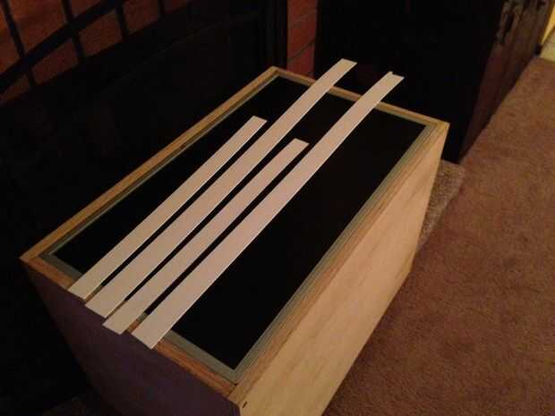 Los bordes. Esta mesa de centro tiene que tener algo para enfocar su atención en el centro. Los bordes grises no. Fui a Lowes para cubrirlo. He encontrado la solución perfecta ! Trimquick Deepscore ( enlace ) básicamente es el guarnecido de plástico que va alrededor de las ventanas. Tiene un lado muy adhesivo y es fácilmente recortar con una cuchilla de afeitar. Muy barato también!
