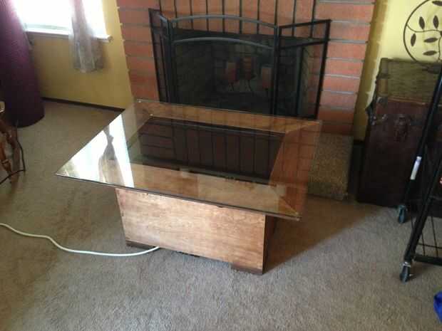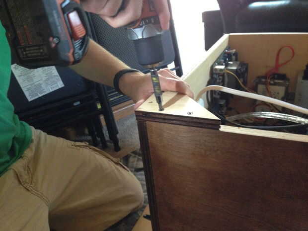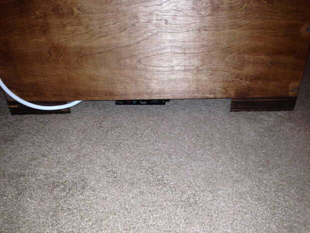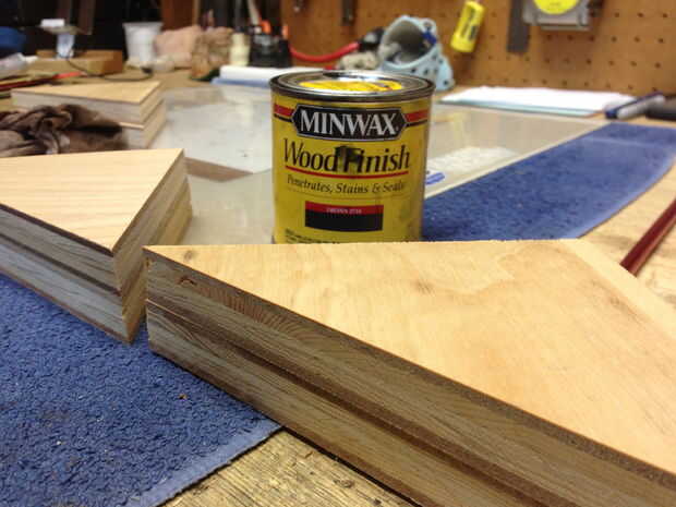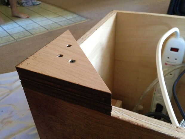Perforé algunos triángulos que había sobrado a las esquinas de la mesa para levantar para arriba para escapar del calor. El primer triángulo fue perforado en la parte inferior de la pierna, entonces el segundo triángulo fue atornillado a la primera. Después de que ha manchado y lija, parece bastante bueno.