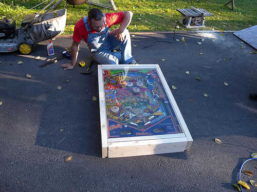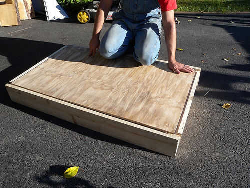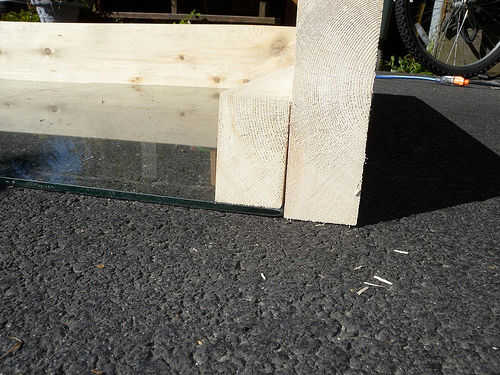 Usé el cedro amarillo para el marco. Muescas en hacia fuera un surco de madera contrachapada en la parte inferior para mayor rigidez. Utilicé tornillos de acero inoxidable que fueron avellanados en la madera para las esquinas del marco. Y utilicé unas tiras a los lados del cristal justo encima del campo de juego de la ayuda.