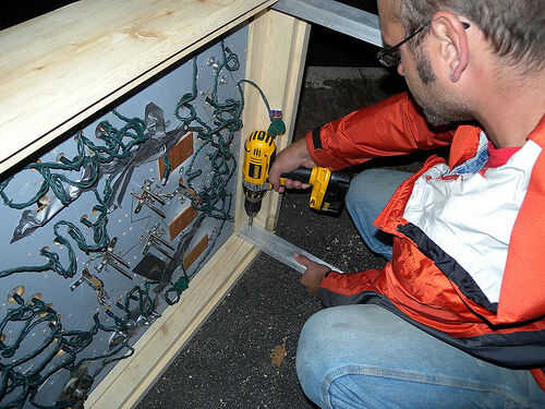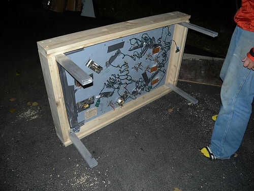 I taladrar agujeros piloto y luego utilizar tornillos para fijar las patas a la estructura en el interior. Mediante el uso de madera corte tuve casi un completo 2 pulgadas de espesor para trabajar con los puntos del anexo de pierna.