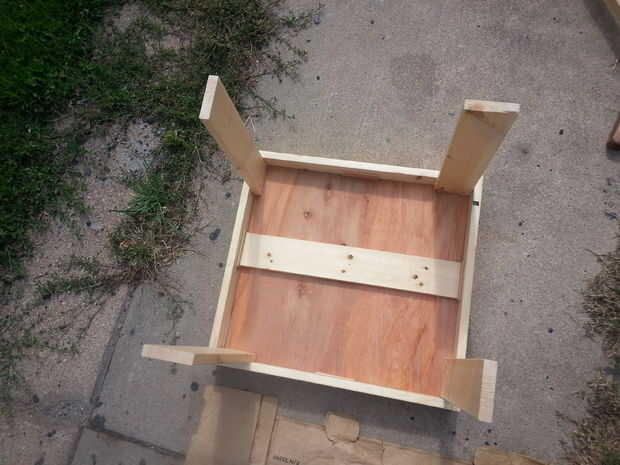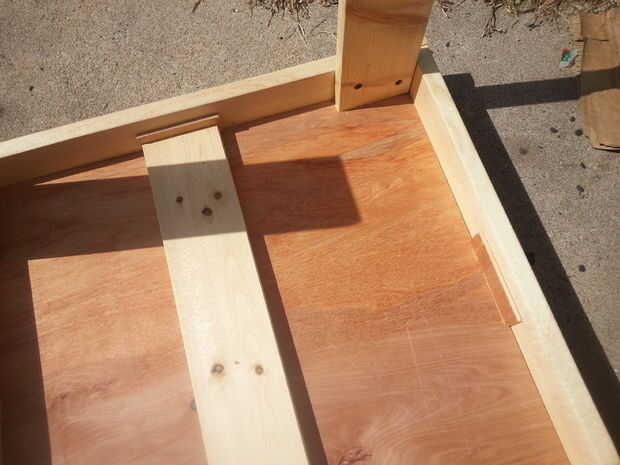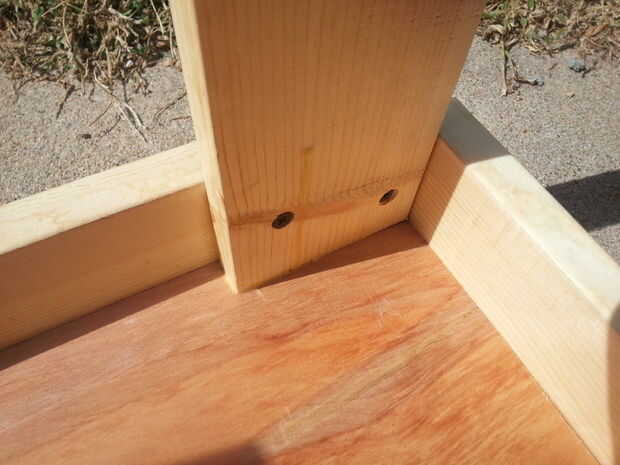 La parte superior de la tabla está hecha de madera contrachapada de 3/16 de pulgada piso contrapiso. Mi ferretería local lo llama caoba de Lauren y su fina y barata. (Bono es tiene alta flexibilidad, he usado para hacer formas curvas de concreto para una acera curvada) Corté un pedazo para caber firmemente en la caja. Los bordes se mantienen por piezas pequeñas (1 x 2 pulgadas) de la madera contrachapada de arpillera y luego en el marco de 1 x 4. Todas las piezas son pegadas y atornilladas.