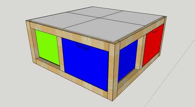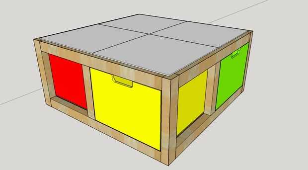 CES las placas sont collées sur le dessus de la tabla en forme de carré, avec 4 boites de rangement en dessous. Pour optimiser le rangement, j ' ai choisi de placer une boite sur chacun des côtés de la tabla. Cela permet également à 4 enfants de, avec jouer une en placa cara et une caisse sur la droite.
