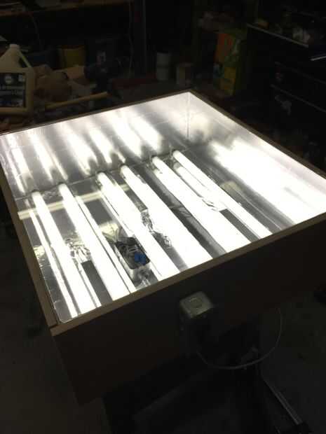 hice esta tabla para las pantallas de 20 x 24, por lo que el tamaño final es 27.5x26x9in. Utilicé restos de madera de una silla mecedora que hice para mi novia de b-día (véase mi instructables otros). usé 3 x 24 en doble accesorios ligeros fluorescentes, pero se podrían hacer fácilmente una mesa más grande con 4' accesorios fluorescentes. necesitarás madera para la caja, accesorios fluorescentes, un interruptor temporizador (o un regular encendido/apagado) y cinta de aluminio (alguna pintura blanca brillante).