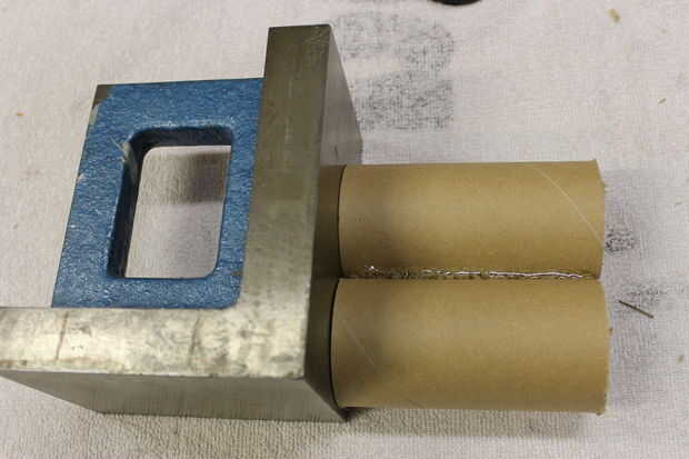 A continuación que deberás unir las piezas. Asegúrese de que estén completamente al ras de un lado. Colocación de ellos en contra de un bloque metálico funciona o si tiene algo de madera cepillada que trabaja demasiado. (Ver imagen) Para la mejor estabilidad sugiero colocar pegamento en ambos lados de la articulación.