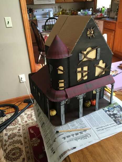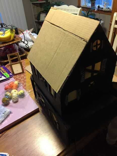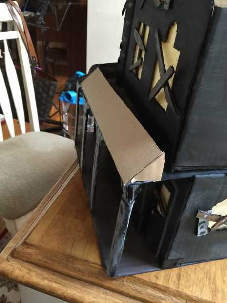 Encontré el techo que mi parte favorita. He añadido el porche, al lado y el pico principal de la casa. Otra vez, cortar todo esto de la cartulina. Para el techo de la torre redonda, utilicé un plato de papel (corte a través de la placa hasta llegar a la mitad) y lo hizo en un cono. Pegan el cono y me sentó en la cima de la torre. Dejé una pequeña sección en la parte posterior abierta en caso de que tenía que entrar a la casa y ajustar las luces.