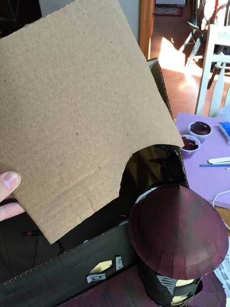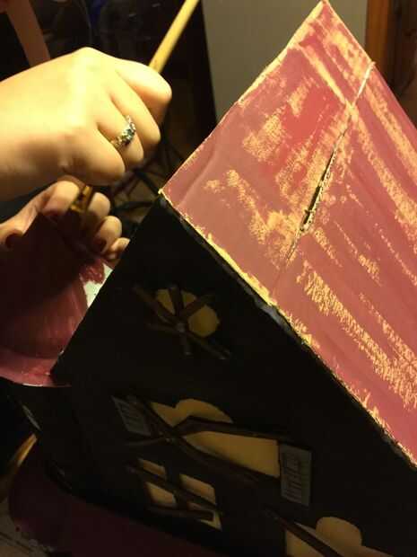 En cuanto al color del tejado, que quería un color contrastante (otra vez, yo quería aprovechar esa edad victoriana clásica). Fui con un Borgoña (a base de rojo, azul y pequeños poco de negro) y pinta el techo. Volví luego con marrón y negro y seco lo cepilló en el techo para que se vea realmente muy viejo.