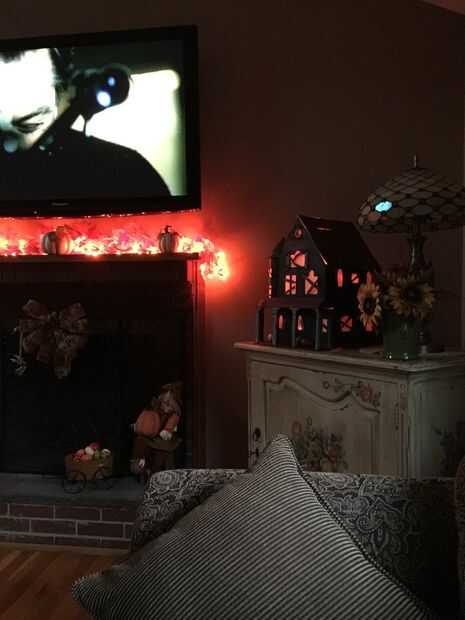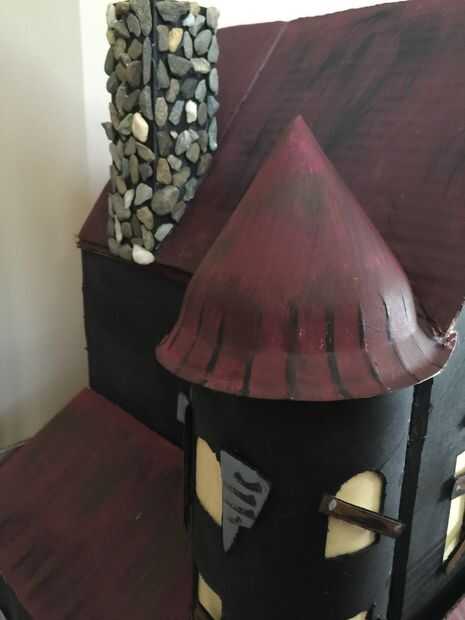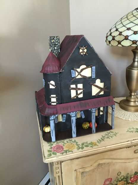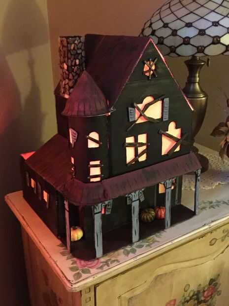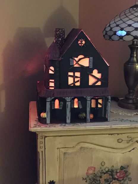 Mi casa embrujada poco está hecho! Se ve impresionante en la mesa de la esquina durante el día y aún más impresionante en la noche cuando está enchufado. Notarás agregué algunas calabazas de espuma poco falso para el porche - creo que añade un toque agradable de final!