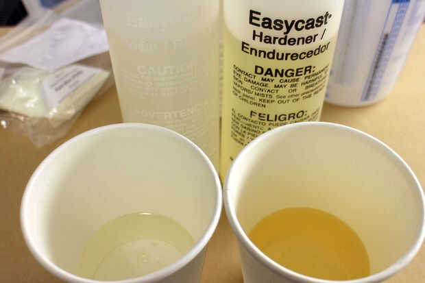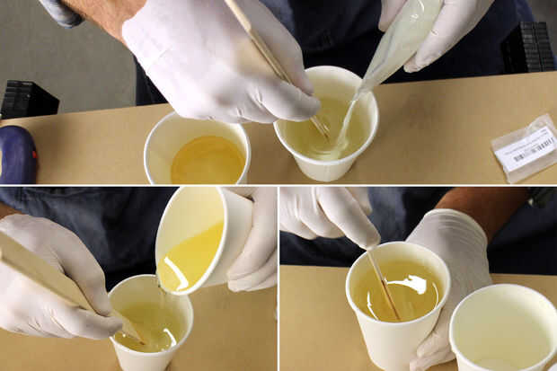 Cuando esté listo añadir el catalizador a la resina y remover enérgicamente hasta que los dos líquidos son una mezcla homogénea. Asegurar a raspar la varilla de mezclar, lados y fondo de la taza. Vierta la mezcla agitada en la Copa de catalizador y continuar revolviendo. El proceso de mezclado debe tomar menos de 2 minutos para que tengas tiempo suficiente para verter la resina sin que ajuste.