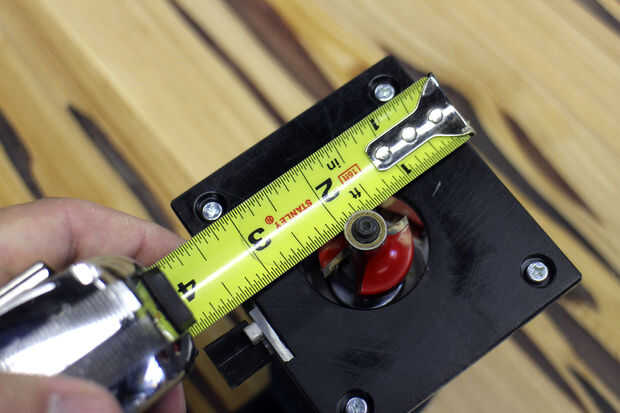 Con la broca de rounderover instalada en el router que me mide la distancia desde el borde del extremo del cojinete al borde de la base de la fresadora, esta distancia sería el revés de la valla. Fijar una guía de borde recto en este revés perpendicular al borde de los lados de la mesa.