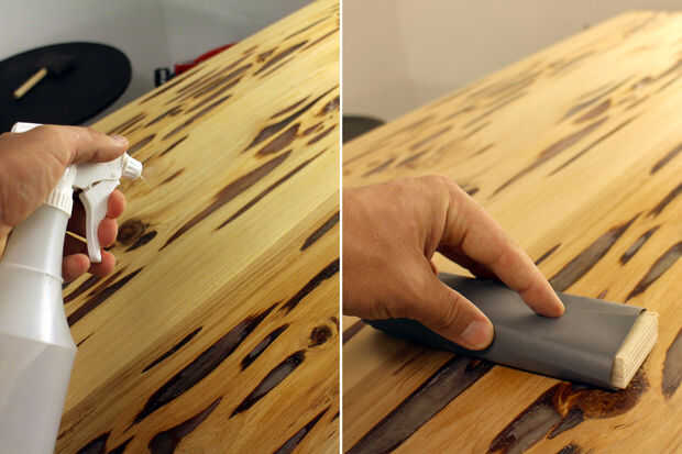 Para conseguir un alto brillo acabado me mojado lijado entre capas de poliuretano. Una vez una capa estaba completamente seca, rocía ligeramente la superficie con agua, luego usa una lija de grano 1200 para suavizar cualquier pinceladas de la anterior capa de poliuretano.