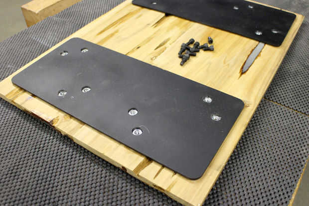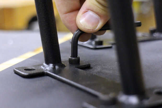 Cuando el adhesivo se haya secado completamente se pueden instalar las patas de la horquilla. Alinee las piernas y enrosque los pernos de anclaje para asegurar las patas en la parte inferior de la tabla.