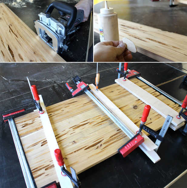 Usando una ensambladora (cortador de la galleta) corté sangrías en los tableros, luego pegar galletas y fijar los tableros juntos. Para asegurar las tablas me alojé cuando apretadas utilicé unos trozos de madera recto en la parte superior e inferior de los tableros.