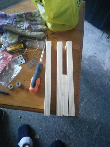 Necesita cuatro longitudes de la madera para los brazos. Tres de ellos deben tener la misma longitud, y la cuarta debe ser la mitad de esa longitud. Mina corté unos 300mm 150mmlong, pero usted puede hacer su lámpara de cualquier tamaño usted tiene gusto. Sólo asegúrese de que la base es suficientemente grande en comparación con la altura que no es inestable.