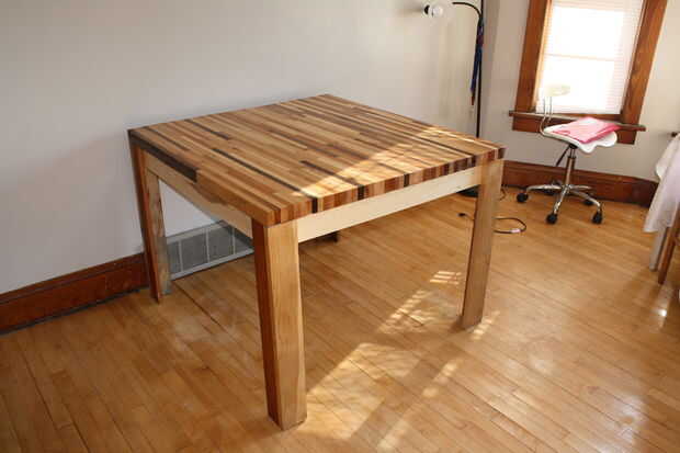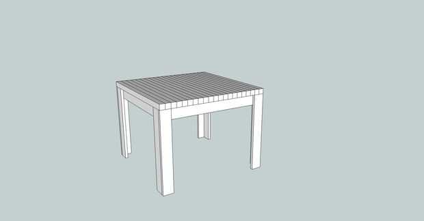 Presenta lo que yo pensaba que la tabla debe buscar como en Google Sketchup (véase archivo). Quería una mesa de estilo de bloque de carnicero, con un patrón al azar de los tipos de madera. El tamaño final terminó siendo 42 "x 42"... mirando hacia atrás que debo tengo fue para una hasta 4'x 4' pero era un montón de lijar como es. Las piernas son 1 "x 4" roble pegado en forma de "L" para mejorar la estabilidad. También he añadido una fina 1 "x 4" de aspen en el interior, ya que quería un color madera más ligera para compensar el roble, como una falda que también añade rigidez un poco.