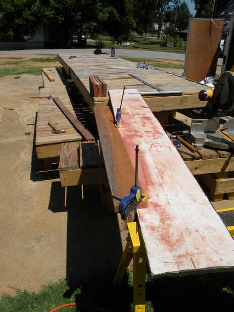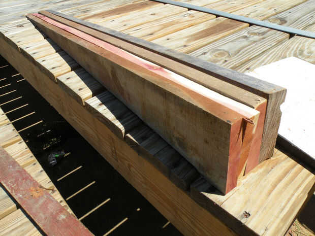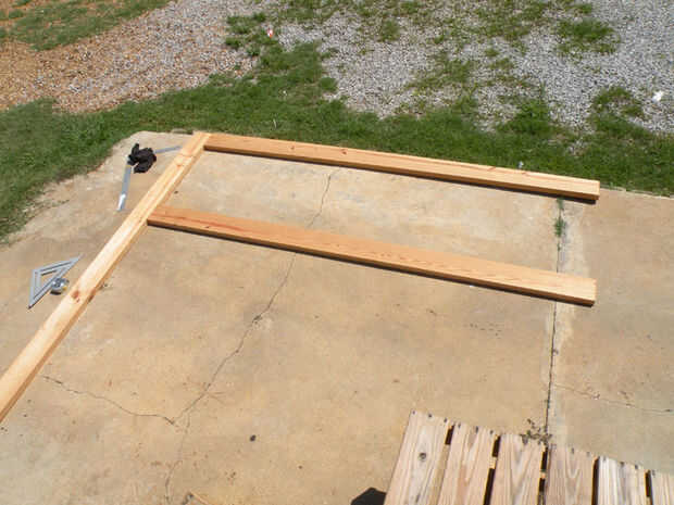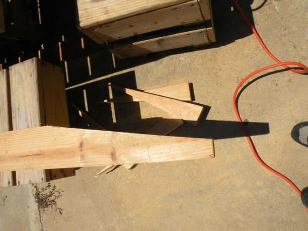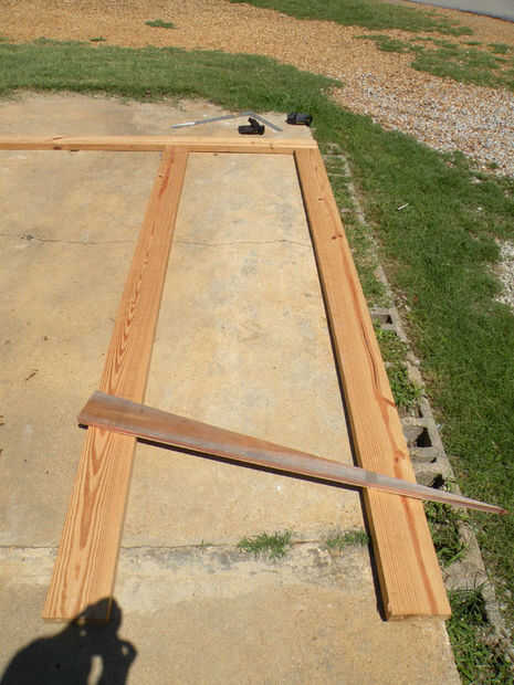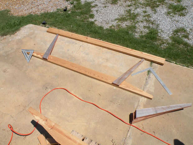 Ahora tienes esta configuración, patas de las de elige la madera para. Opté por unos trozos de cedro de 2 "x 6" sacamos de la pila. Los corté a unos 4', trazando una línea desde una esquina a la opuesta. Con la sierra circular, corté un lo largo de esta línea, creando 8 triángulos largos.