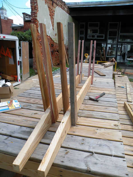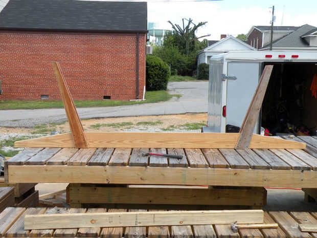 Usamos trozos de pino amarillo de 2 "x 8" para las vigas de los caballetes. Corta los extremos en un ángulo, desde 2" de la parte superior hasta el punto donde están fijadas las patas. Pares de patas de atornilla y pega las un en de las vigas, como se ve en las fotos. Tornillos en usa al menos 4, lo bastante largos para pasar por la viga y meterse en la pata opuesta.